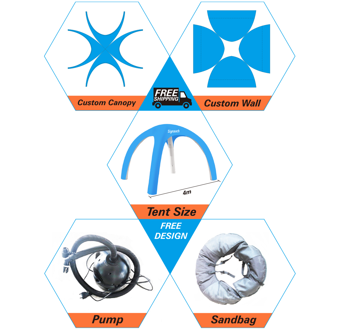 Price include one airdome tent frame , one custom printed roof , one pump, and four sandbags , and four spikes , Production time is : 15-20 working days.